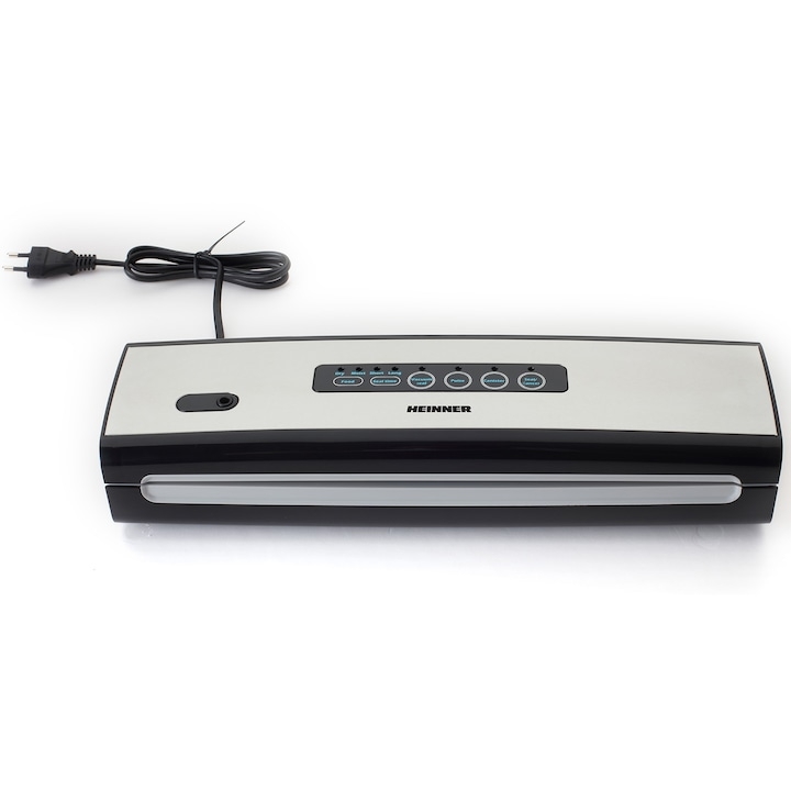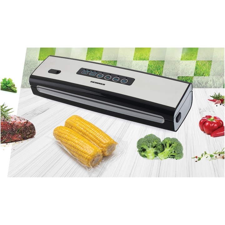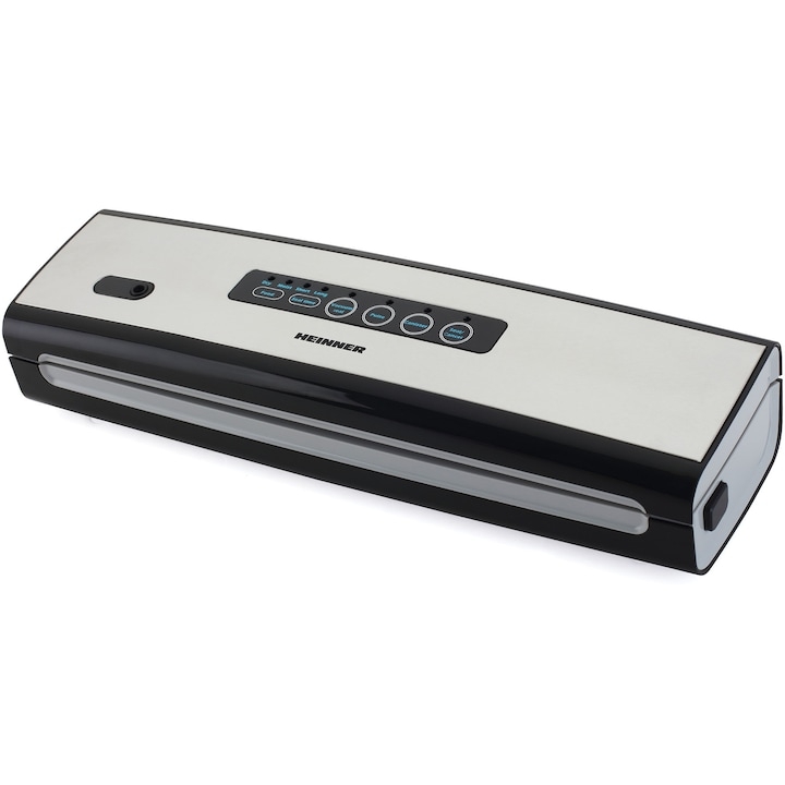 Aparat de vidat si sigilat Heinner Food Power 130 HAV-130BKSS, vidare si sigilare, vidare uscata/ umeda, rola pungi inclusa 20x200 cm, mini-cutter incorporat, compatibil cu pungi latime 30 cm, capacitate vidare 6 l/ min, 0.58 bar, 130W, argintiu