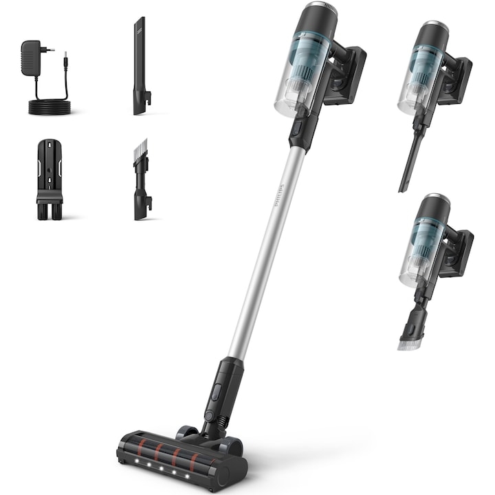 Aspirator vertical Philips XC3031/01, seria 3000, sistem de filtrare in 3 etape, autonomie 60 de minute, cap de aspirare cu LED, negru/argintiu