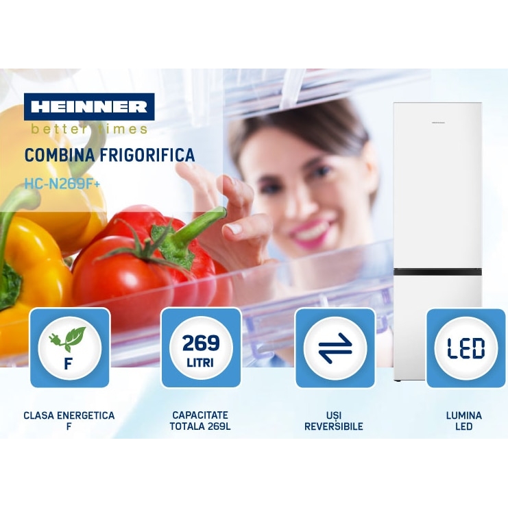 Combina frigorifica Heinner HC-N269F+, 269 l, Clasa F, Control mecanic, H 180 cm, Alb
