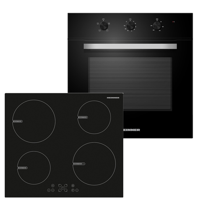 Pachet Cuptor incorporabil Heinner HBO-M654G-GBK, Electric,70 l, Timer mecanic, Grill, Iluminare, Clasa A, Sticla neagra + Plita incorporabila Heinner HBHI-V591BTC, Inductie, 4 zone de gatit, Touch control, Boost 1 zone, 60 cm, Negru