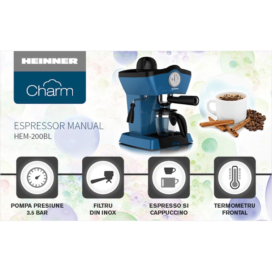 Espressor manual Heinner Charm HEM-200BL, 800W, 250ml, 3.5 bar, Albastru