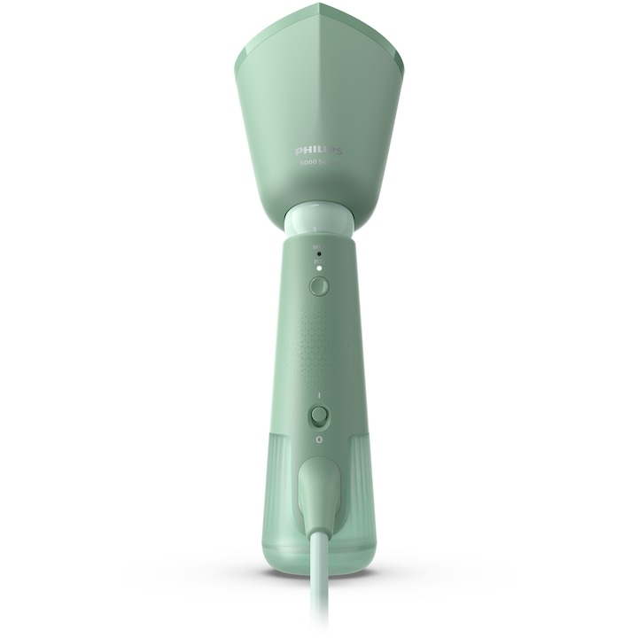 Aparat de calcat vertical portabil Philips STH5010/70 Seria 5000, 1300W, debit de abur 24 g/min, rezervor de apa 120 ml, cap reglabil pentru calcare verticala si orizontala, saculet depozitare, verde