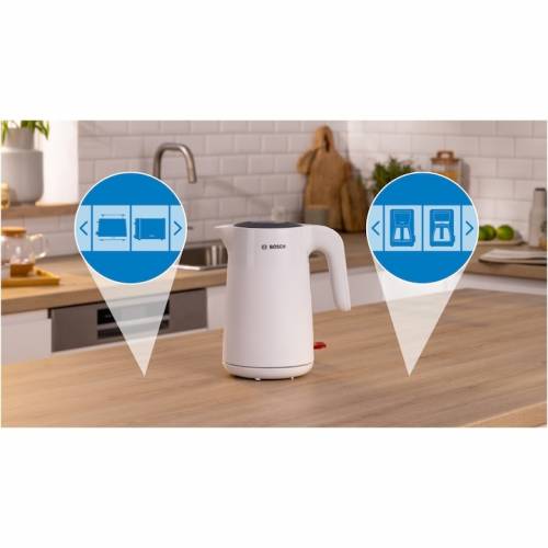 Fierbator de apa Bosch TWK2M161, 1.7l, filtru de calcar,oprire automata, protectie impotriva supraincalzirii si functionarii fara apa, oprire in momentul ridicarii canii de pe suport, Alb