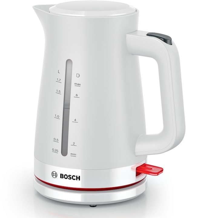 Fierbator de apa Bosch TWK3M121, 1.7l, filtru de calcar,oprire automata, protecţie împotriva supraincalzirii şi funcționarii fara apa, oprire în momentul ridicarii canii de pe suport, Alb