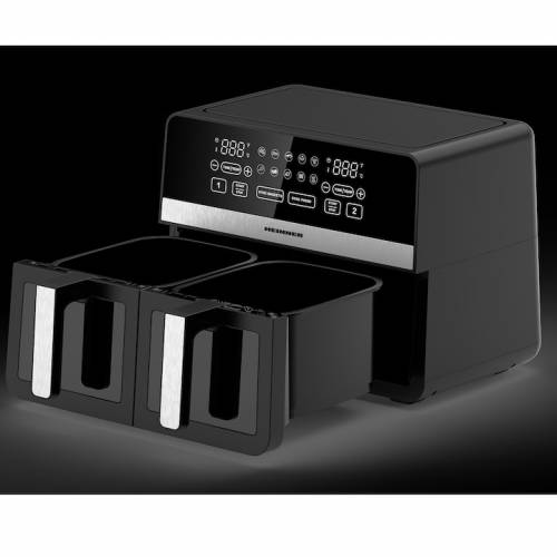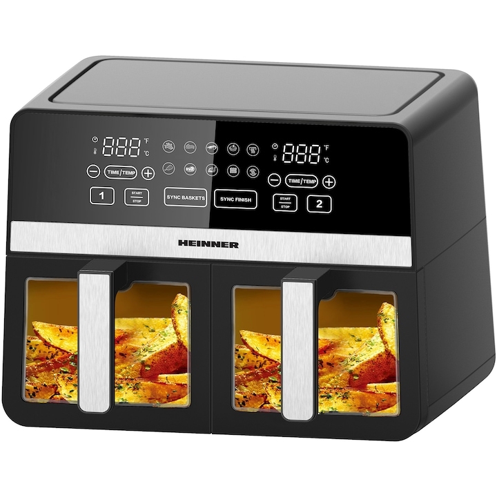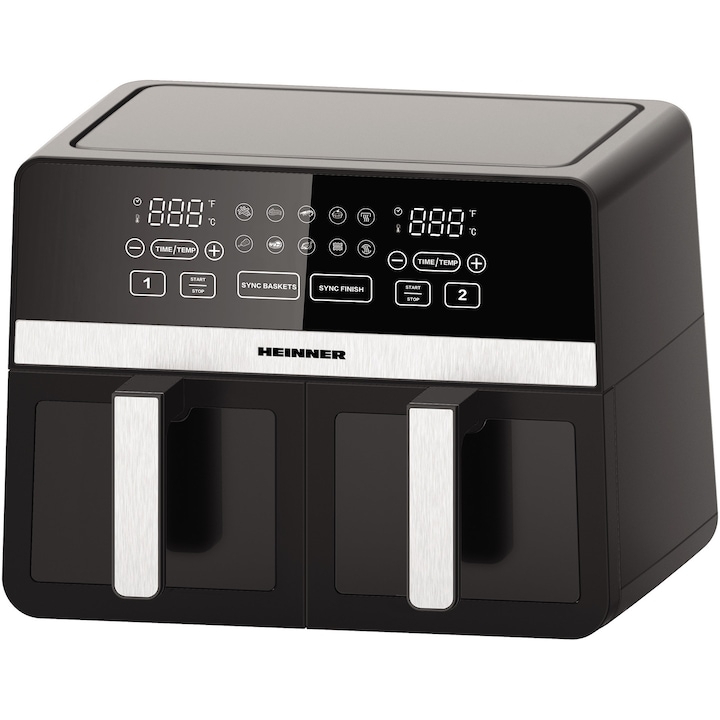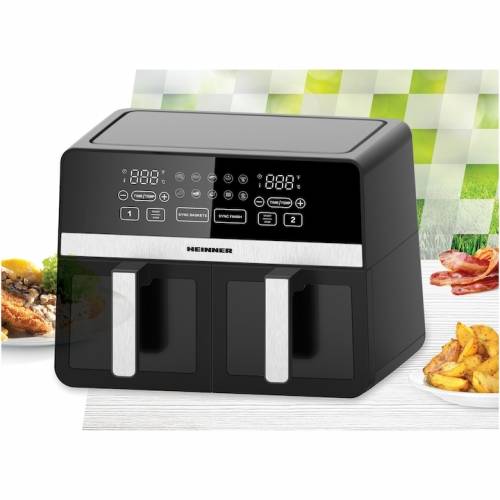 Friteuza dubla cu aer cald Heinner SimCook HAF-K10DB24BK, 2400W, capacitate 9.5L, termostat reglabil cu afisaj LED, control digital individual, 10 programe prestabilite, temporizator 60 min. cu avertizare sonora, Negru