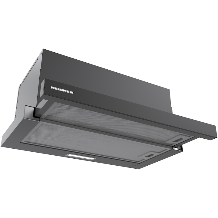 Hota telescopica Heinner HTCH-MD600GBK, 60cm, 630 m3/h, 2 trepte de viteza, motor: 1 x 215w, lumina led: 1 x 1.5w, 2 filtre aluminiu, diametru tub de evacuare: 150 mm, negru+sticla