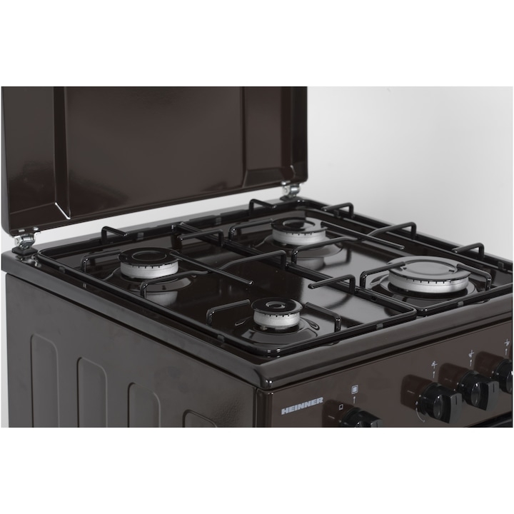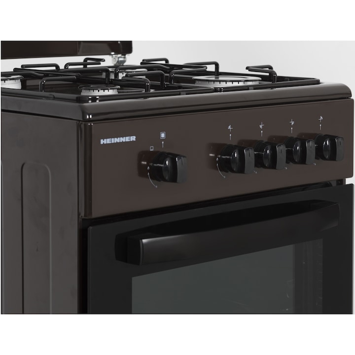 Aragaz Heinner HFSC-SME50BRW, Gaz, 4 arzatoare, Dispozitiv siguranta plita si cuptor, 50 cm, Maro