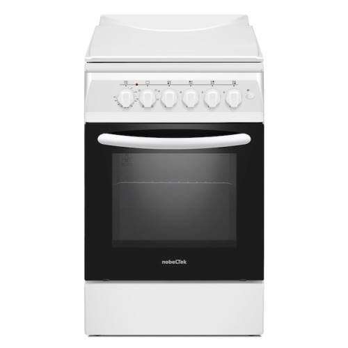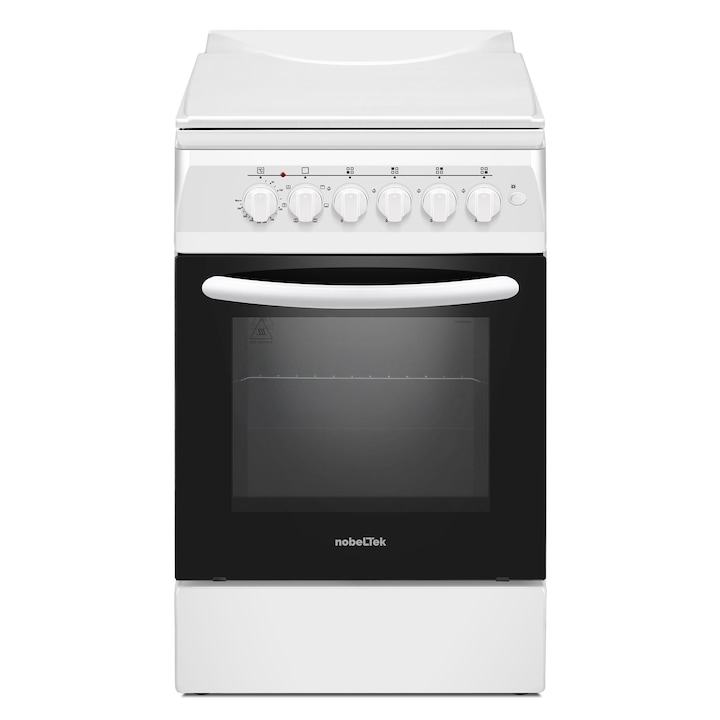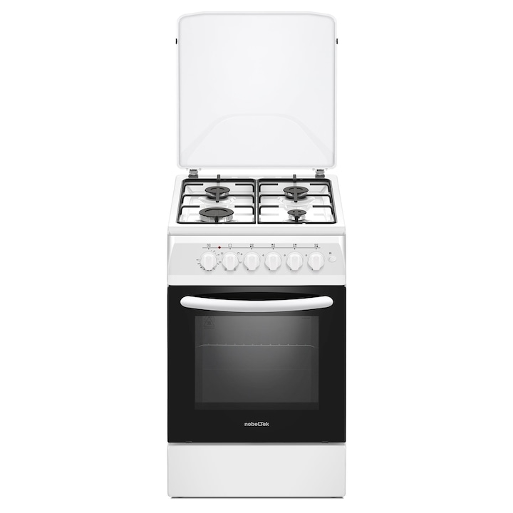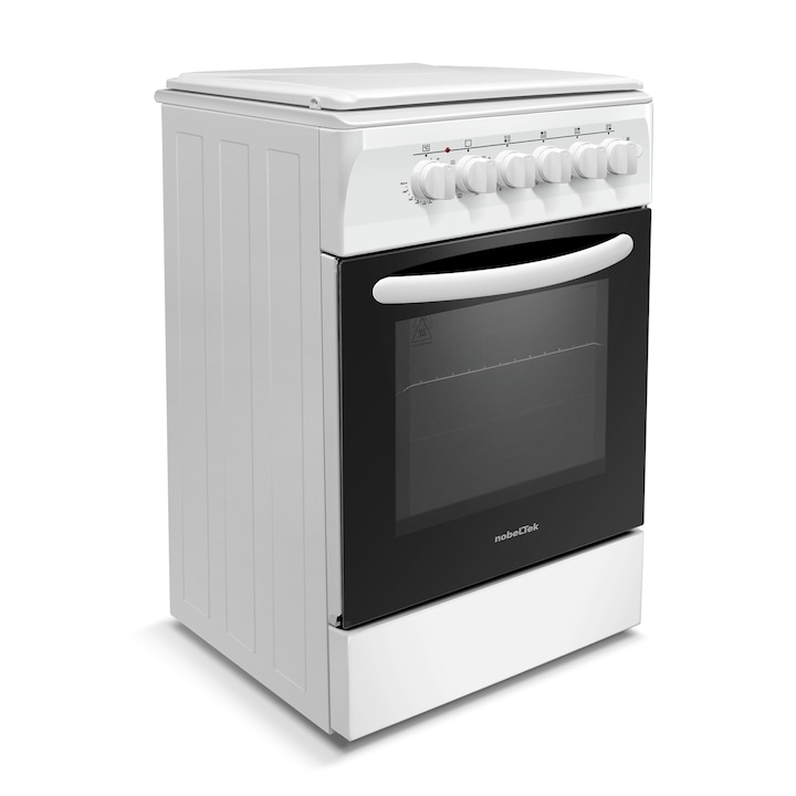 Aragaz Nobeltek NLT 5604A/E1, plita gaz si cuptor electric, ventilator, aprindere electrica plita, siguranta plita, iluminare cuptor, echipat cu diuze GN, diuze GPL de schimb, capac tabla, Alb