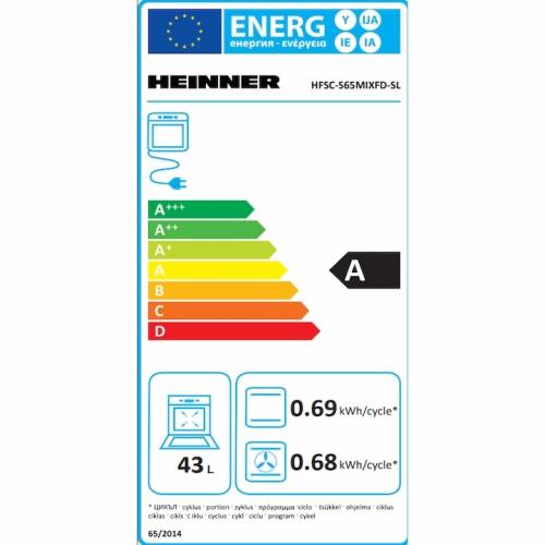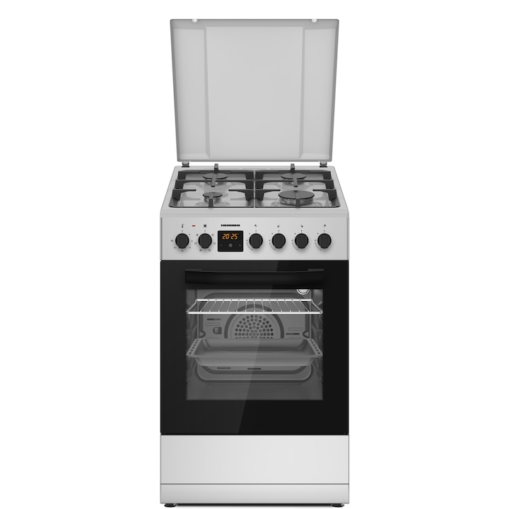 Aragaz mixt Heinner HFSC-S65MIXFD-SL, 50X60 cm, 4 arzatoare, Timer digital, Suport fonta, Capac metalic, Aprindere electrica plita, Dispozitiv siguranta plita, Cuptor electric, Clasa A, 6 functii, Tava si gratar cromate, Argintiu