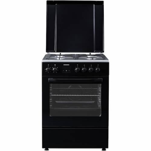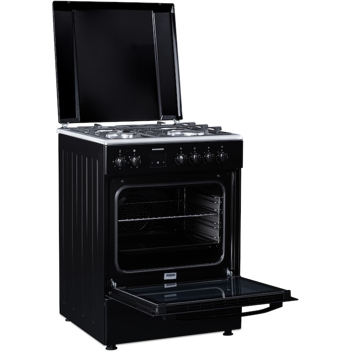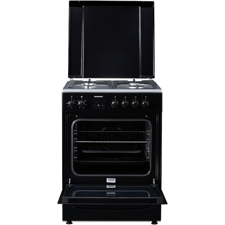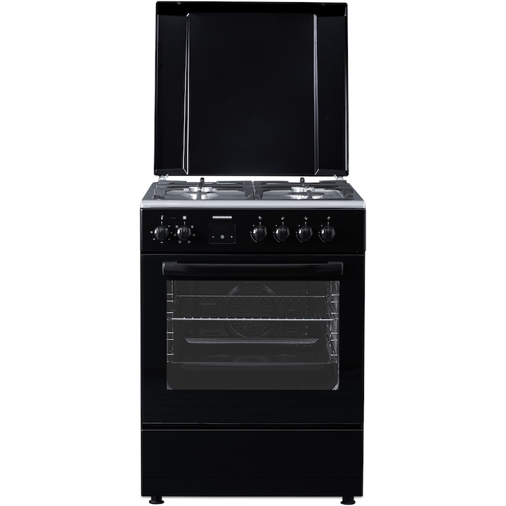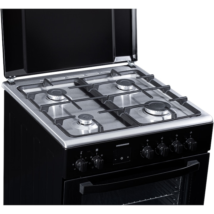 Aragaz mixt Heinner HFSC-S66FDCC-IBK, digital, 4 arzatoare, cuptor electric, autocuratare catalitica, timer, grill, ventilatie, aprindere electrica plita, sertar inferior vase, 60x60 cm, negru