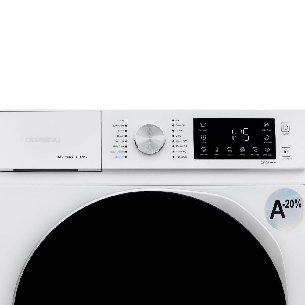 Masina de spalat rufe Daewoo DWD-FV5021-5, 8 kg, motor inverter, 1200 rpm, clasa A-20%, 16 programne, butoane touch, Alb