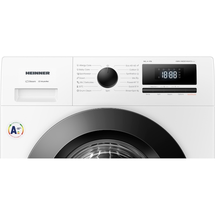 Masina de spalat rufe HEINNER HWM-HME9014IVA10+++, 9 KG, 1400 RPM, Clasa A-10%, MOTOR INVERTER, Display digital, Program Allergy steam, Alb