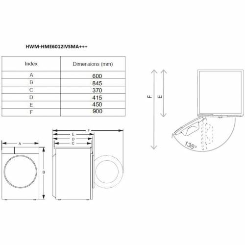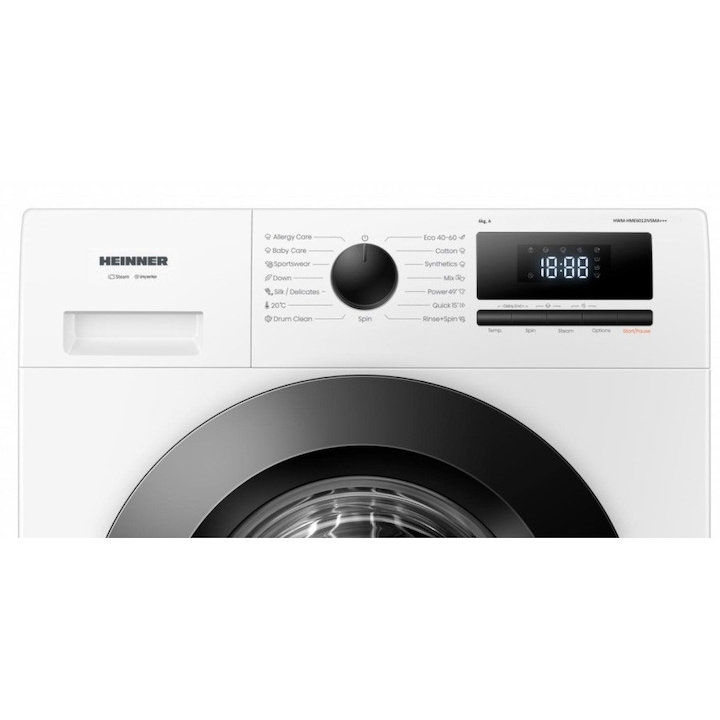 Masina de spalat rufe slim Heinner HWM-HME6012IVSMA+++, 6 kg, 1200 rpm, Clasa A, Motor inverter, 15 programe, Display digital, Program rapid 15 min, Program allergy steam, Program baby steam care, Functie adaugare rufe, Blocare acces copii, Alb