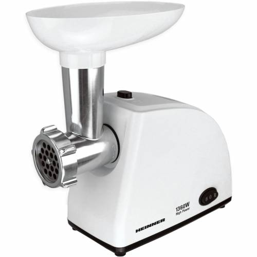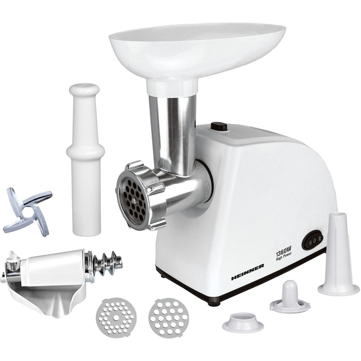 Masina de tocat Heinner MG-W1200R, 1360W,1.5 kg/min, accesoriu rosii, accesoriu carnati, cutit inox, 3 site taiere, alb