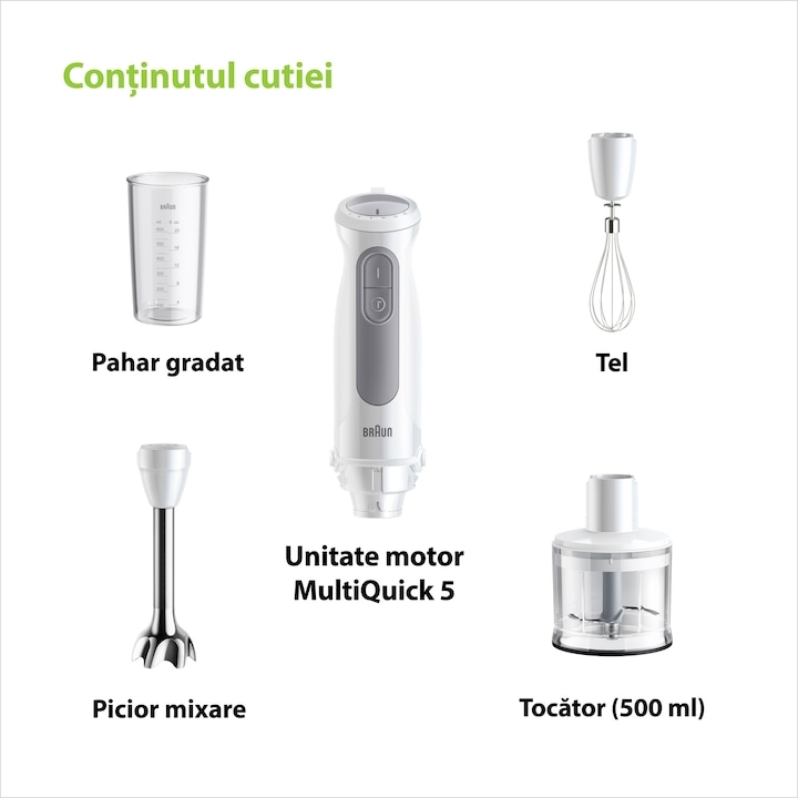 | Continut pachet | 1 x Tel 1 x Tocator 1 x Mixer vertical 1 x Pahar gradat |