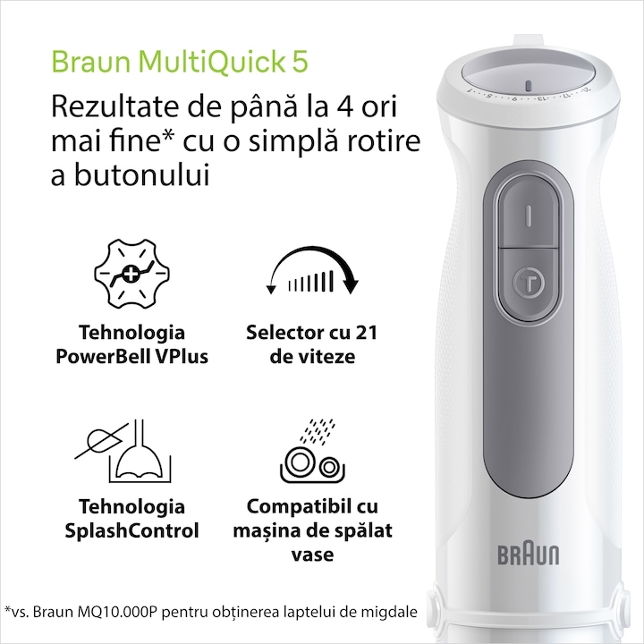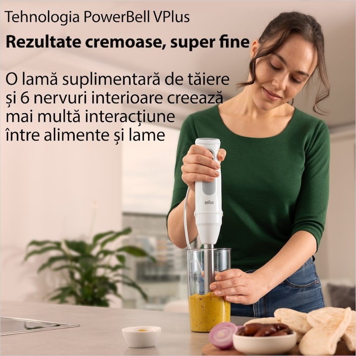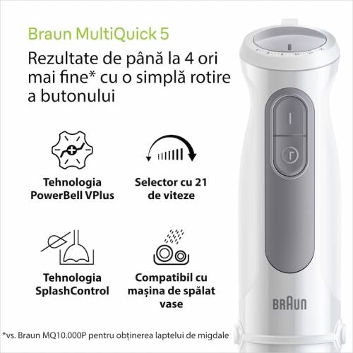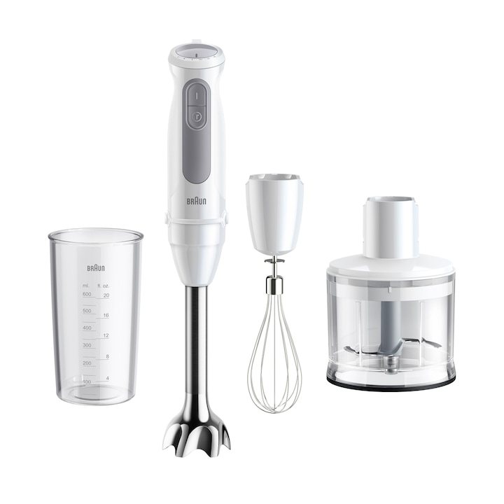 Mixer vertical Braun MQ50236M, 1000 W, 21 trepte viteza, Functie Turbo, Tocator 500 ml, Tel, Pahar gradat 600 ml, Alb/Gri
