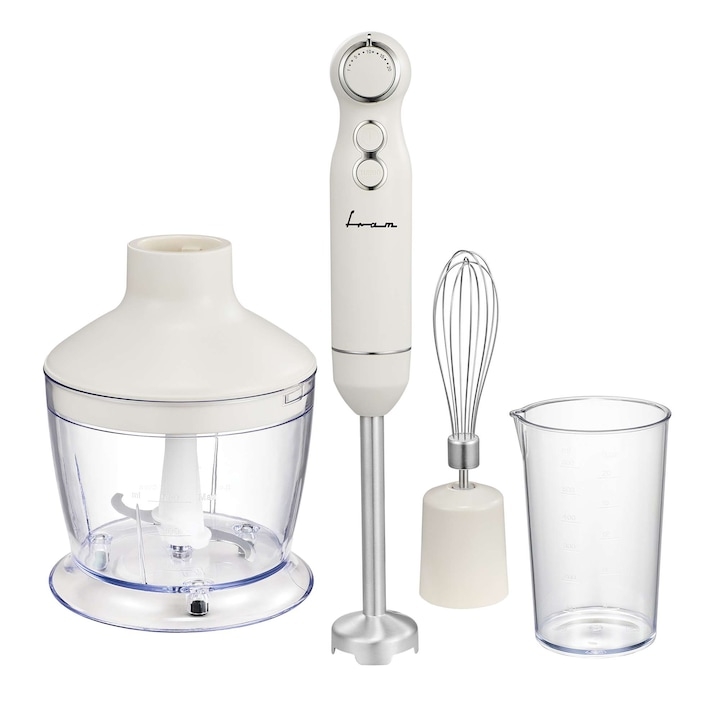Mixer vertical Fram FHBL-RAC1200CR, 1200W, viteza variabila, functie Turbo, accesorii: tocator, tel, cana de mixat, picior blender din inox, motor DC, capacitate tocator: 500 ml, capacitate cana de mixare: 600 ml, buton ON/OFF, Crem