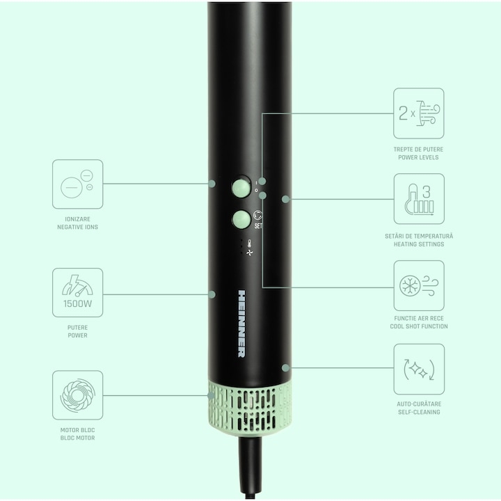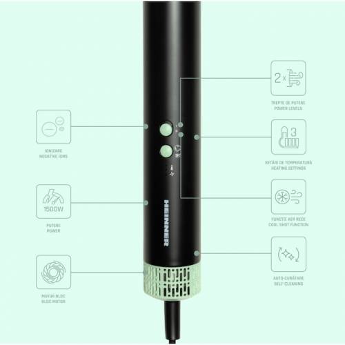 Aparat de coafat profesional Heinner HAS-R15BLDC-BK4, Motor BLDC, 1500 W, 2 trepte de putere, 3 setari de temperatura, Functie auto curatare, Ionizare, Functie aer rece, ondulator stanga, ondulator dreapta, perie rotunda mare, uscator, Negru cu verde