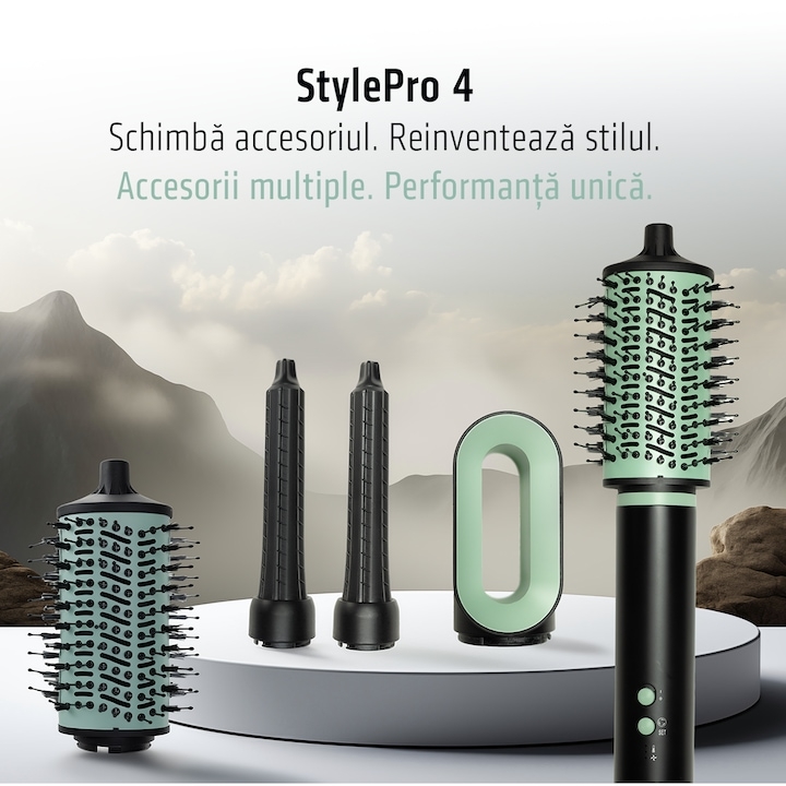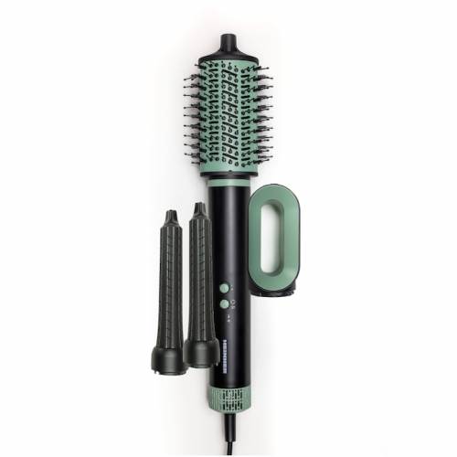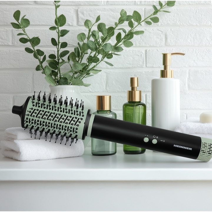 Vizualizează-36%Perie cu aer cald Heinner HAB-Y12DC-GR1, Motor DC, 1200 W, 2 trepte de putere, Ionizare, Functie aer rece, Accesorii: perie rotunda medie, Verde cu alb