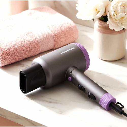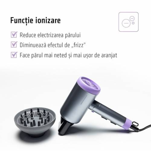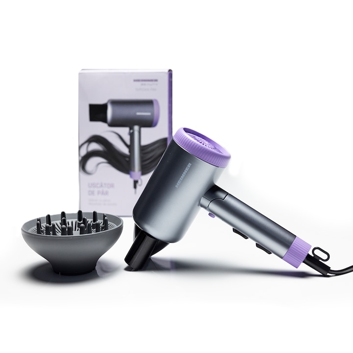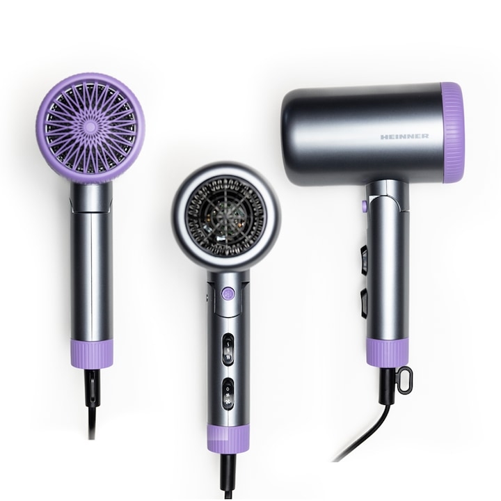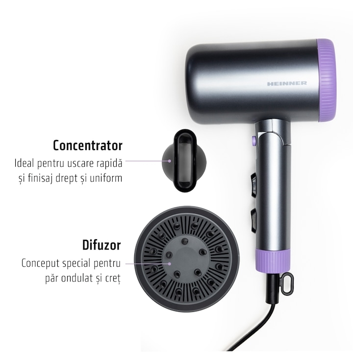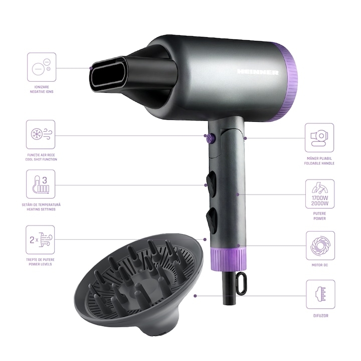Uscator de par Heinner HHD-R20DC-GYV, Motor DC, 1700-2000 W, 2 trepte de putere, 3 setari de temperatura, Ionizare, Functie aer rece, Maner pliabil, Accesoriu: concentrator, Gri si mov